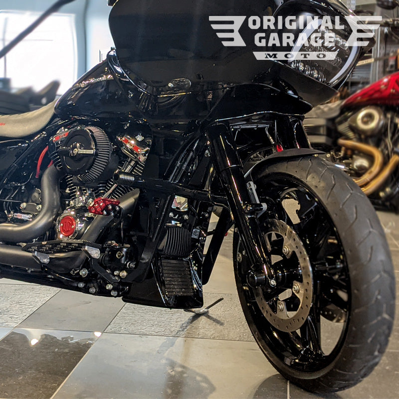 *All models including newer CVOs equipped with 21'' front wheels must check front wheel/fender clearance before riding. Crash Bar may not clear at full travel. Please check clearances before riding. We suggest running our either our Bagger Shorty Carbon Fiber Fender Kit, 1'' fork extensions and/or stiffer forks springs/cartridges for an easy fix. Feel free to call us if you have any questions.